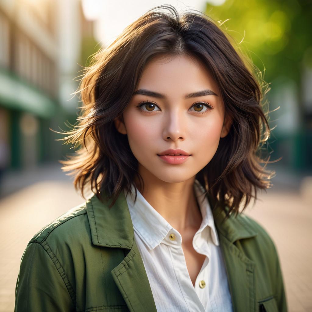 Photograph of a young woman with medium-light skin and short, wavy black hair illuminated by sunlight. She has dark, defined eyebrows, almond-shaped brown eyes, and full, slightly parted lips with a neutral pink shade. She wears a green military-style jacket over a white button-up shirt. The background is blurred, suggesting an urban street setting with indistinct buildings and a bright, sunlit atmosphere. The image has a sharp focus on her face, highlighting her natural beauty and calm expression. The lighting creates a soft halo effect around her hair.