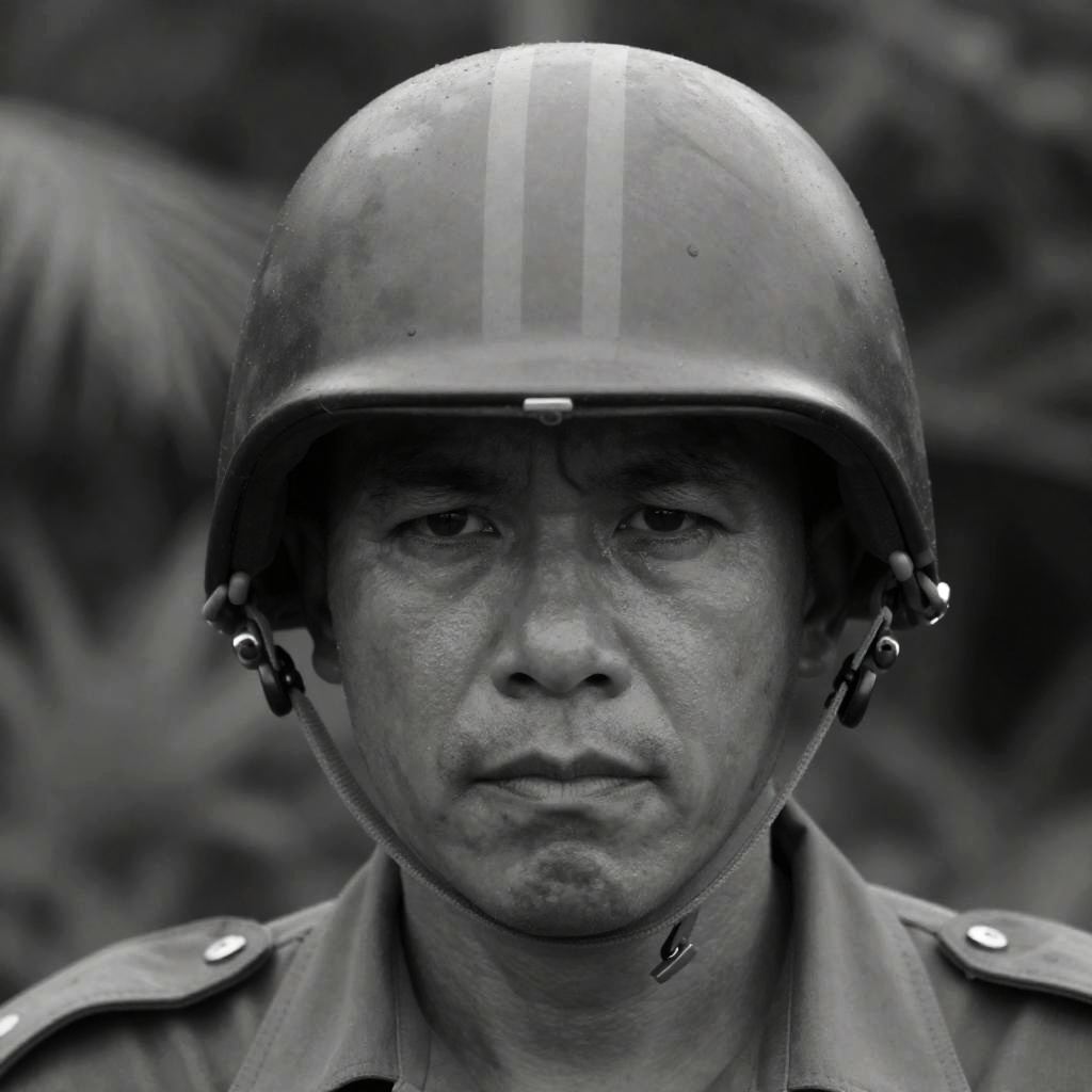 Black and white photograph of a soldier wearing a military helmet and camouflage uniform, holding binoculars and looking intently upward. The background includes a baseball bat and a circular target, with a cloudy sky overhead. The soldier has a focused expression, and the image conveys a sense of vigilance and observation.