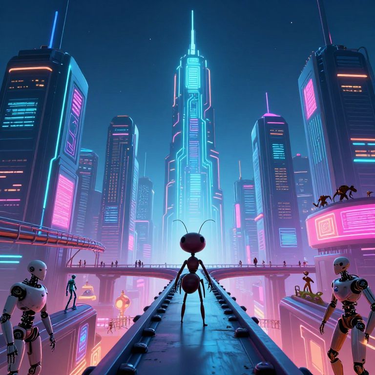 Digital art of a neon-lit, futuristic cityscape featuring a giant, iridescent, robotic insect with glowing multicolored eyes and wings,
