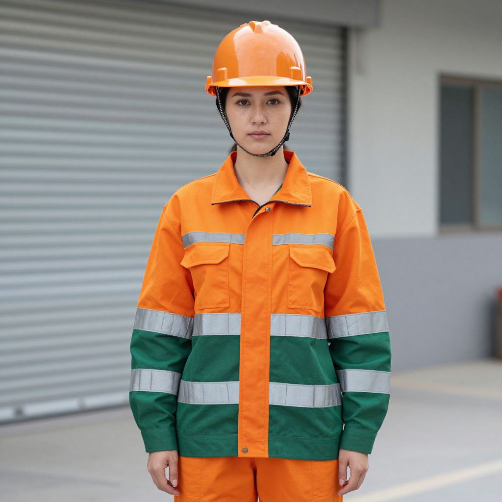 Photograph of an Asian woman in an orange and green safety uniform with reflective stripes, wearing an orange hard hat, standing in front of a gray,