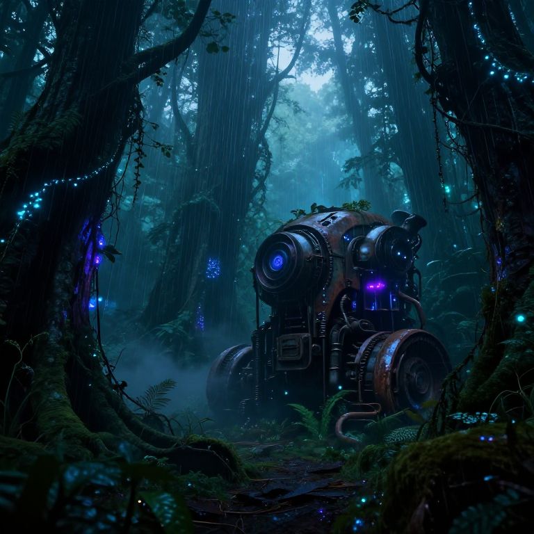 A futuristic, glowing robot with blue lights stands in a dark, misty, enchanted forest, surrounded by towering trees and luminescent fireflies.