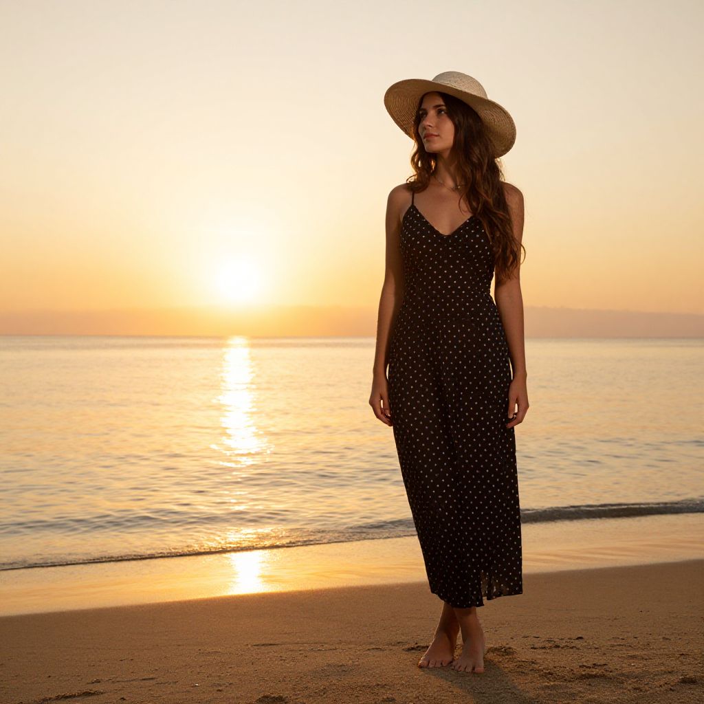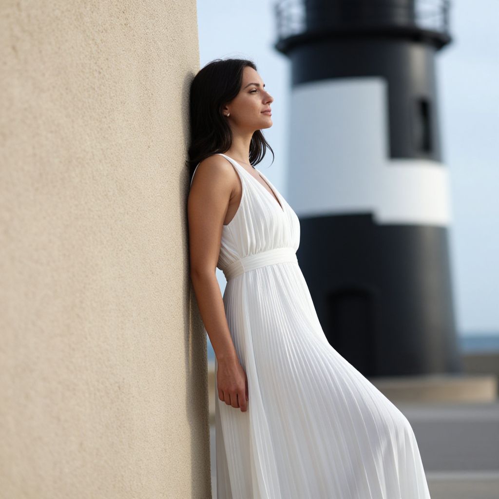 A woman with long dark hair leans against a textured wall near a black and white lighthouse, wearing a flowing pleated white dress. The natural lighting highlights her serene expression and the coastal setting, evoking a calm and elegant atmosphere.