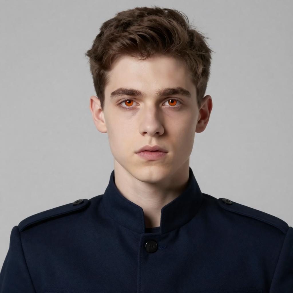 Photograph of a young man with fair skin, brown hair, and intense orange eyes, wearing a dark blue military-style jacket. He has a serious expression, slightly parted lips, and a neutral background. Close-up, centered, head-and-shoulders shot.