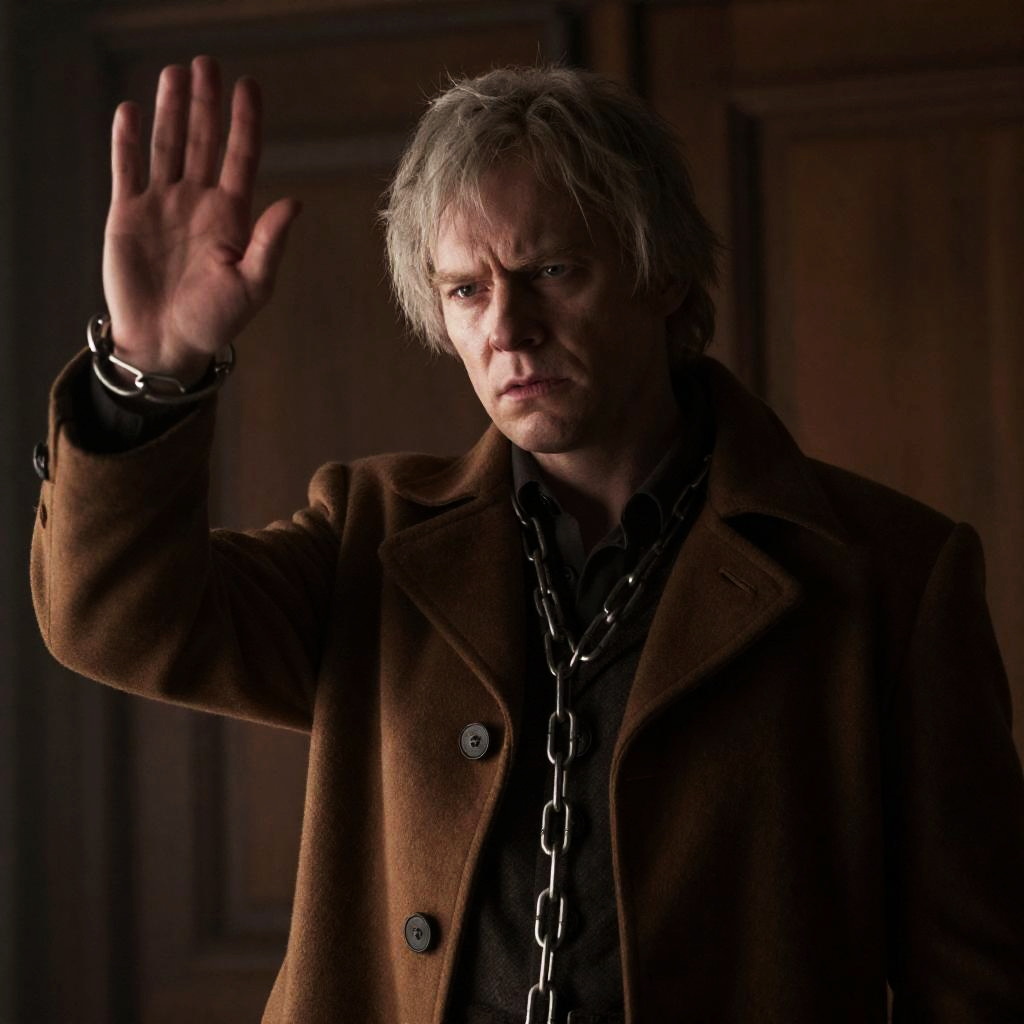 A pale man with disheveled gray hair, wearing a brown coat with heavy chains, raises his right hand. Intense expression, eyes slightly narrowed. Dark wooden background, soft light from the left. Chains on coat and wrists. Lower half of face and upper body visible. Movie still.