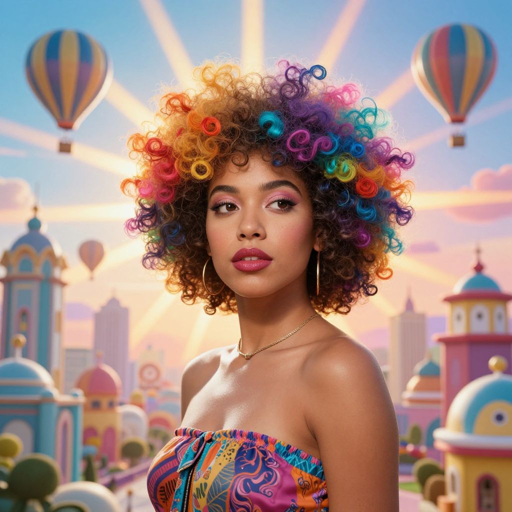 Photorealistic digital art of a young Black woman with a vibrant, rainbow-colored afro hairstyle. She wears a strapless, multicolored, paisley-patterned top. Her makeup includes pink eyeshadow and bold pink lipstick. She gazes directly at the viewer with a calm expression. The background features a bright, colorful cityscape with pastel-colored buildings, hot air balloons, and a radiant sunburst effect. The sky is a gradient of blue to pink, adding to the whimsical, dreamlike atmosphere. The image combines vivid colors and smooth textures, creating a lively and enchanting scene.