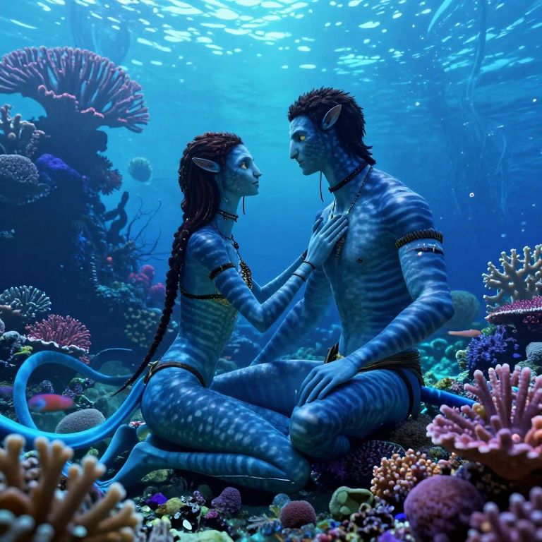 A mesmerizing digital art composition portraying an idyllic underwater scene in a style reminiscent of James Cameron's \"Avatar\". The captivating image captures a tender moment between a Na'vi couple amidst the vibrant, thriving coral reef. The female Na'vi, draped in flowing garments that harmoniously blend with her environment, tenderly places her hand on her partner's chest as he returns her gaze with adoration. Shot from an unconventional low-angle perspective, this piece emphasizes the intricate details of the corals and the captivating patterns on their skin, creating a sense of depth and awe within this enchanting world. The palette is dominated by rich shades of blue, turquoise, and purple, evoking a profound atmosphere of serenity, tranquility, and deep connection to nature.