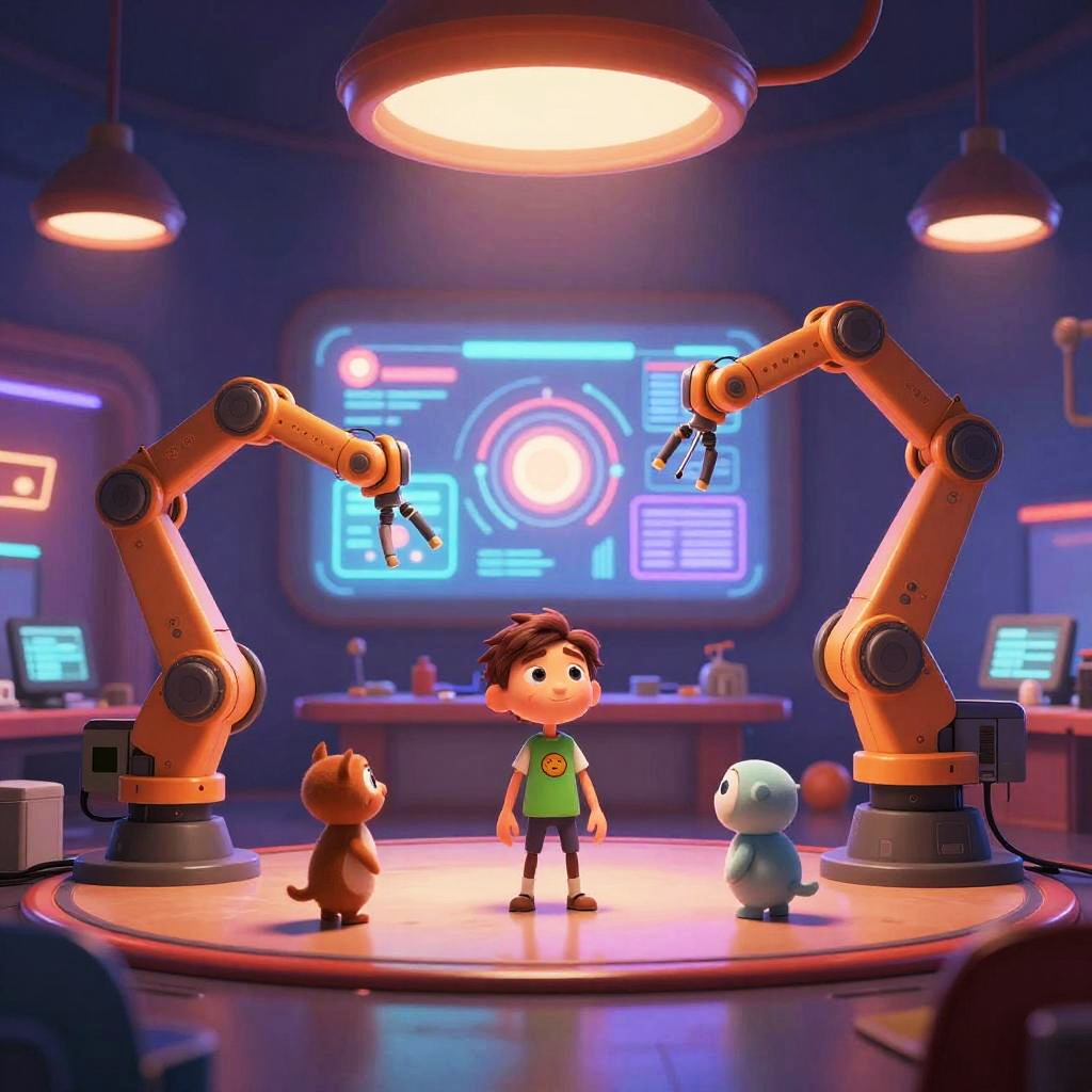 Pixar AI concept art showcasing a futuristic animation studio filled with advanced AI technology, colorful robotic arms designing characters, soft glowing lights, vibrant digital interfaces, and a creative atmosphere inspired by Pixar's signature style.