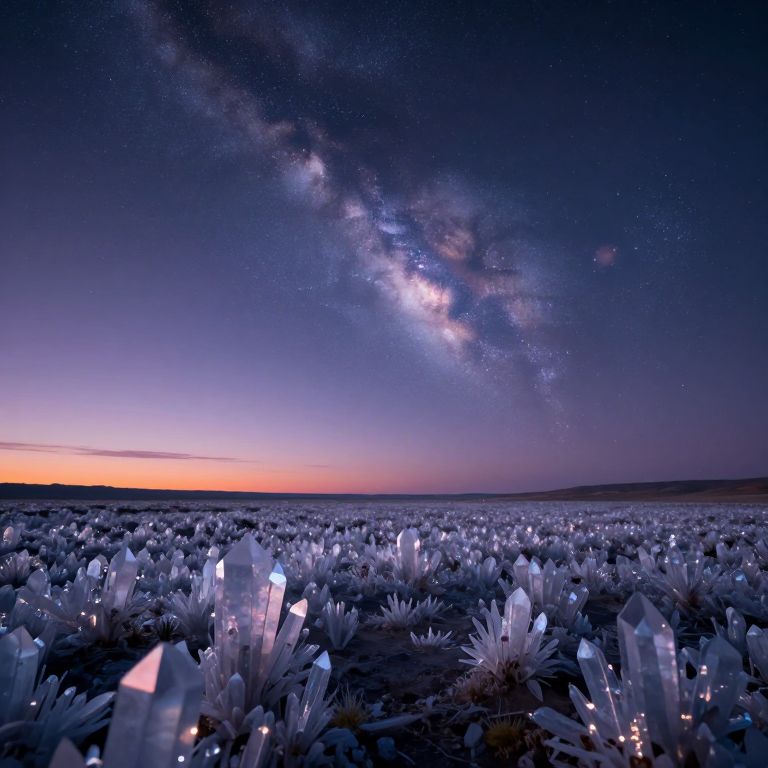 Photograph of a nighttime landscape featuring a vast field of glowing, crystal-like plants with white, luminescent tips. The sky above is a deep, dark blue, transitioning to a faint orange hue near the horizon, with the Milky Way galaxy prominently visible, stretching diagonally across the sky. The crystals are scattered uniformly across the field, creating a magical, ethereal atmosphere. The scene is serene and otherworldly, with the glowing plants contrasting against the dark sky and horizon. The texture of the field is rough and rocky, while the sky is smooth and starry.