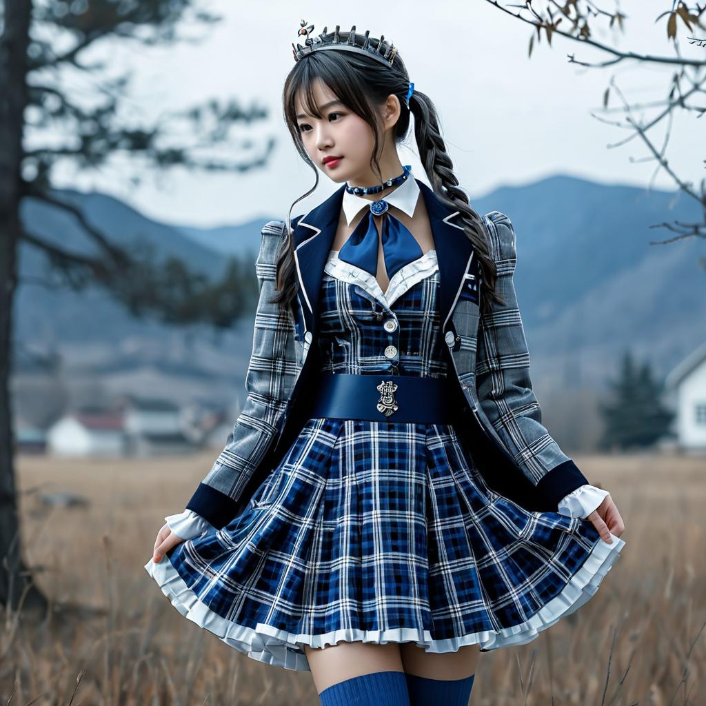 Masterpiece, best quality, highres, sui1, 1girl, solo, side ponytail, hoshimachi suisei, single thighhigh, jewelry, single sock, thigh strap, bracelet, blue socks, buttons, single kneehigh, plaid dress, blue choker, blue belt, plaid skirt, mini crown, grey skirt, blue ascot, long sleeves, plaid jacket, cowboy shot, embarrassed, blush, (dress lift:1.3), (panties:1.2), outdoors