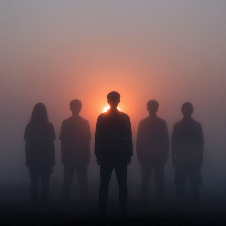 Five silhouetted figures stand in unison against a dusky sky, their forms partially obscured by a thick, ethereal fog that drifts around them as the sun sets in vibrant hues behind the central figure.
