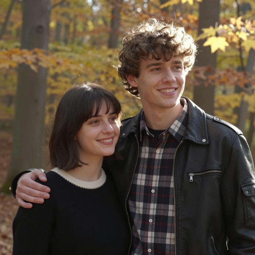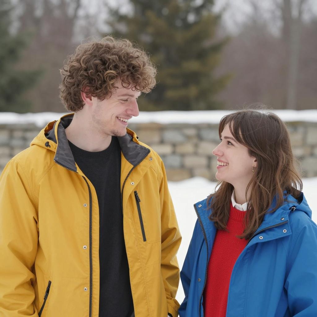 Two people standing outdoors. Man with curly brown hair, yellow jacket, black shirt, smiling. Woman with brown hair, blue raincoat, red sweater, smiling at man. Background: blurred trees, stone wall, snow. Man on left, woman on right. Both looking at each other.