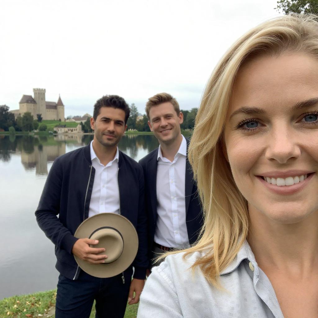 Photograph of three people. Close-up of a smiling blonde woman with blue eyes on the right. Two men in the background, one with dark hair holding a hat, standing by a reflective lake with a castle in the distance. Woman's light-colored patterned shirt, men in dark jackets and white shirts. Bright, soft lighting.