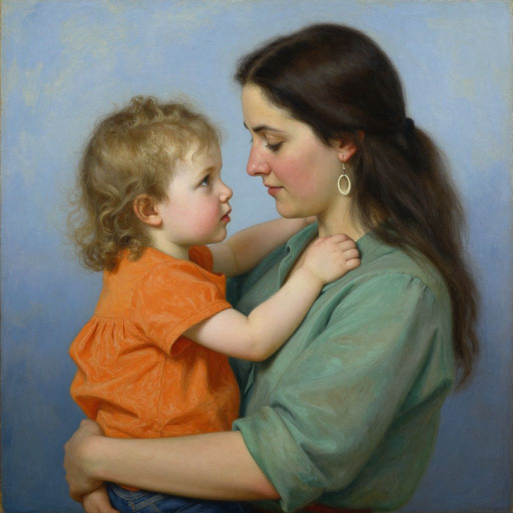 This is a digital painting in a classical realism style. It depicts a Caucasian woman with long, dark brown hair and fair skin, wearing a green, long-sleeved blouse and teal earrings. She tenderly holds a blonde, curly-haired toddler in her arms. The child, with a fair complexion and rosy cheeks, wears an orange dress with short sleeves. The woman's face is in profile, gazing softly at the child, who looks slightly to the side. The background is a smooth gradient of blue and gray, adding depth to the portrait. The woman's left hand gently rests on the child's back, highlighting their close bond.