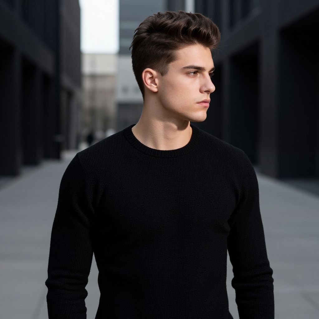 Photograph of a handsome young man with a well-groomed, short, dark brown haircut, styled upwards. He has a fair complexion and a serious expression, looking to the right. He's wearing a black, textured, long-sleeve sweater that fits snugly, highlighting his muscular build. The background shows a modern urban setting with tall, dark buildings and a gray, concrete sidewalk. The lighting is natural, casting soft shadows.