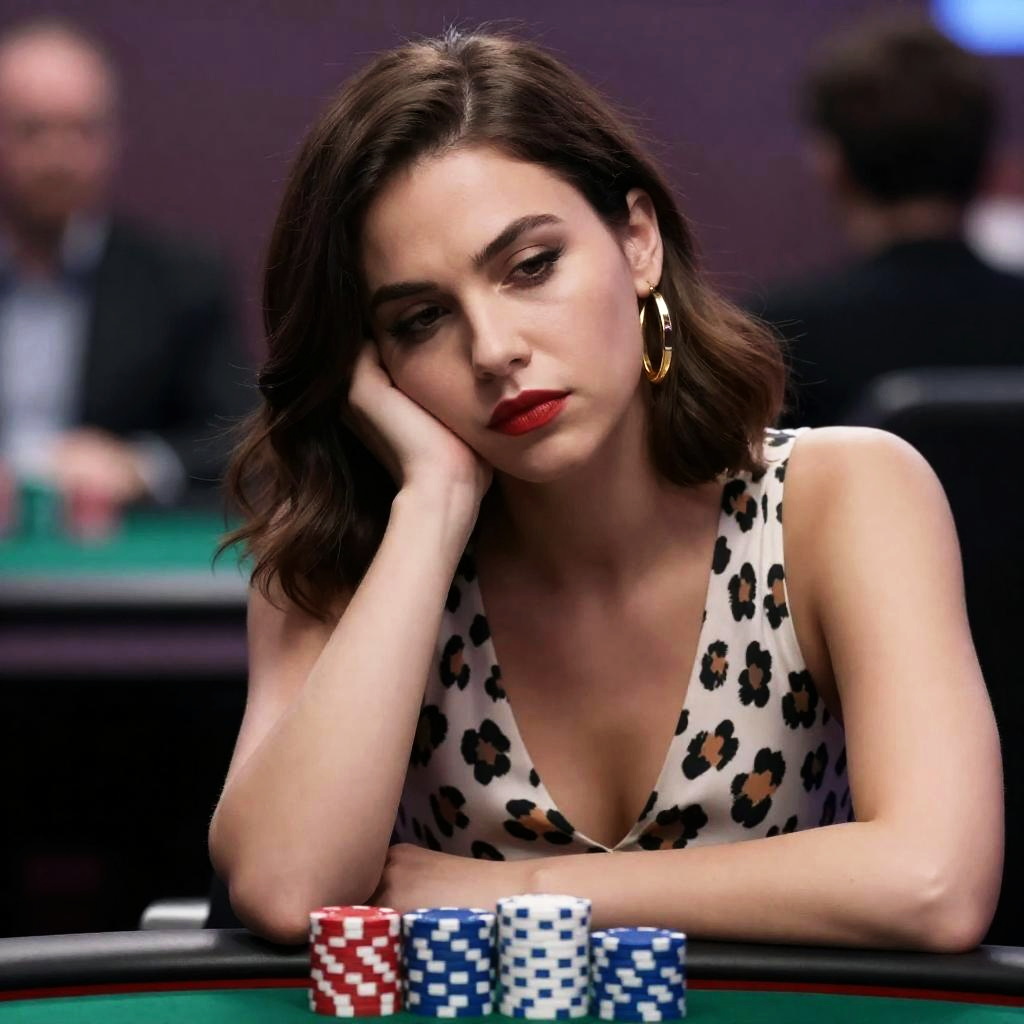 A young woman with short brown bob hair wearing a black sleeveless dress is seated at a poker table. She holds a pen in one hand and looks upward with a focused expression. In front of her are stacks of poker chips in multiple colors and a glass of white wine. The background features blurred figures and modern indoor lighting, suggesting a casino or poker room setting.