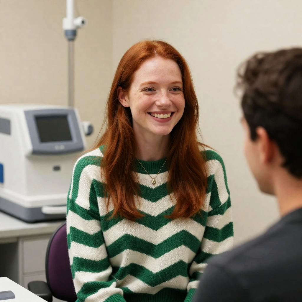 Red-haired woman with fair skin and green-and-white zigzag sweater smiling at man with dark hair. Office setting with beige walls, medical machine, and purple chair. Woman's necklace with small pendant. Man's back facing camera. Light, friendly atmosphere.