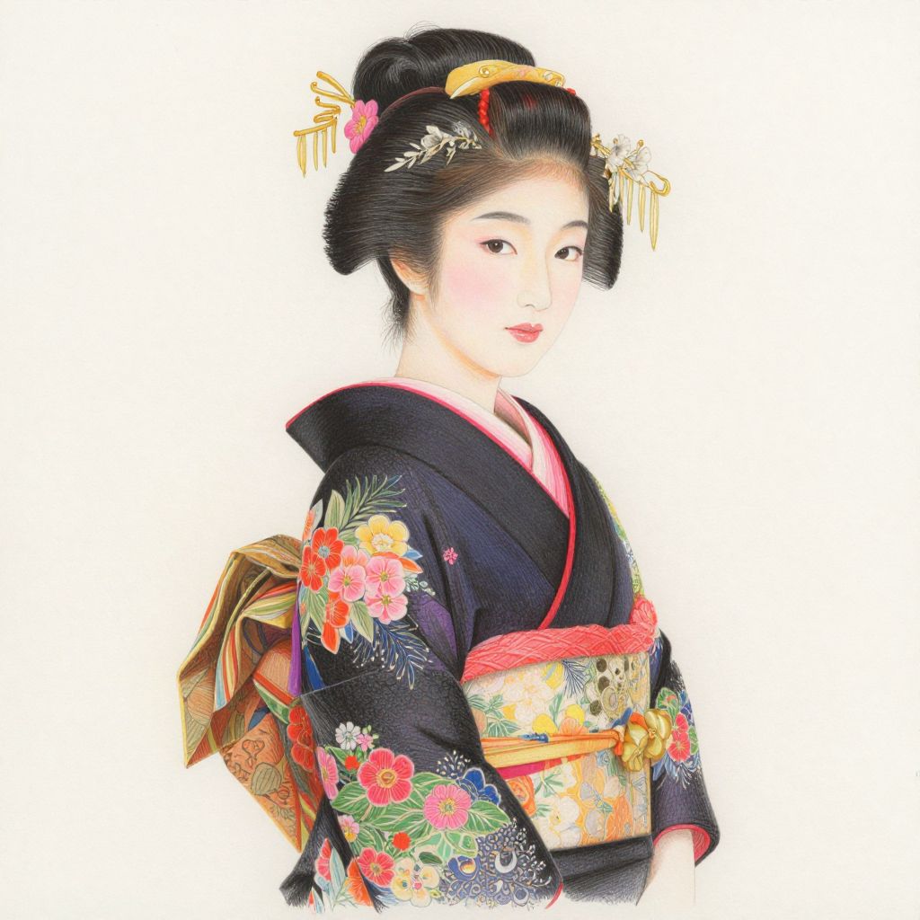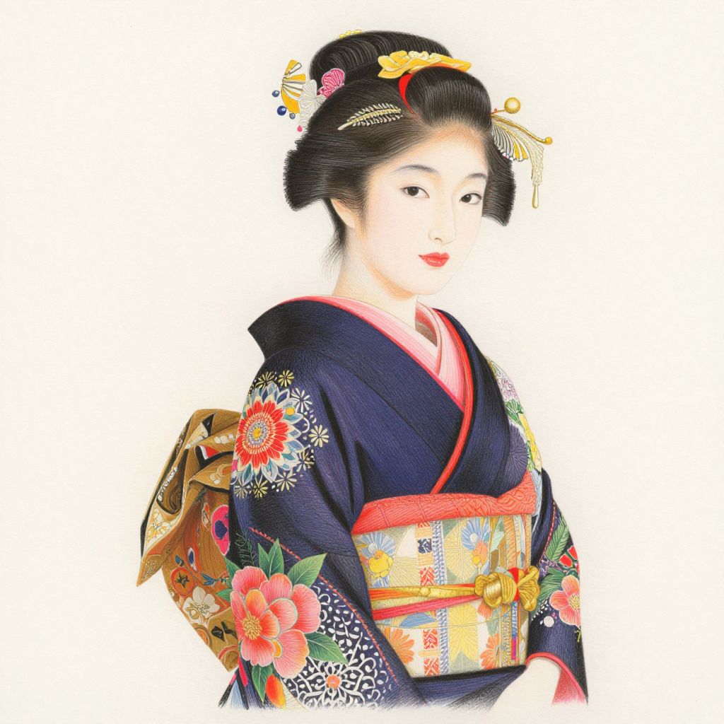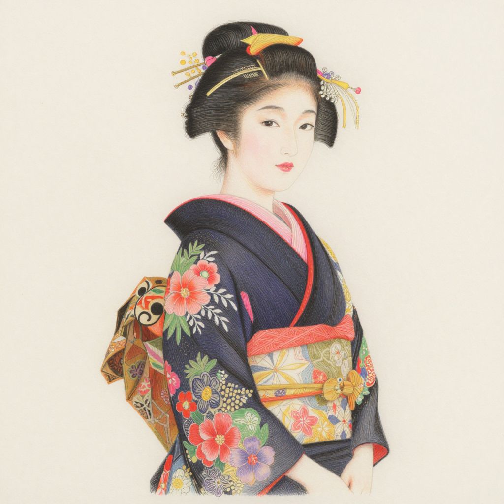 Elegant portrait of a woman in traditional Japanese attire, adorned with vibrant floral accents and intricate details, rendered in colored pencils on Velin BFK Rives paper, measuring 280 x 335 mm, created in August 2015 by Kiyono.