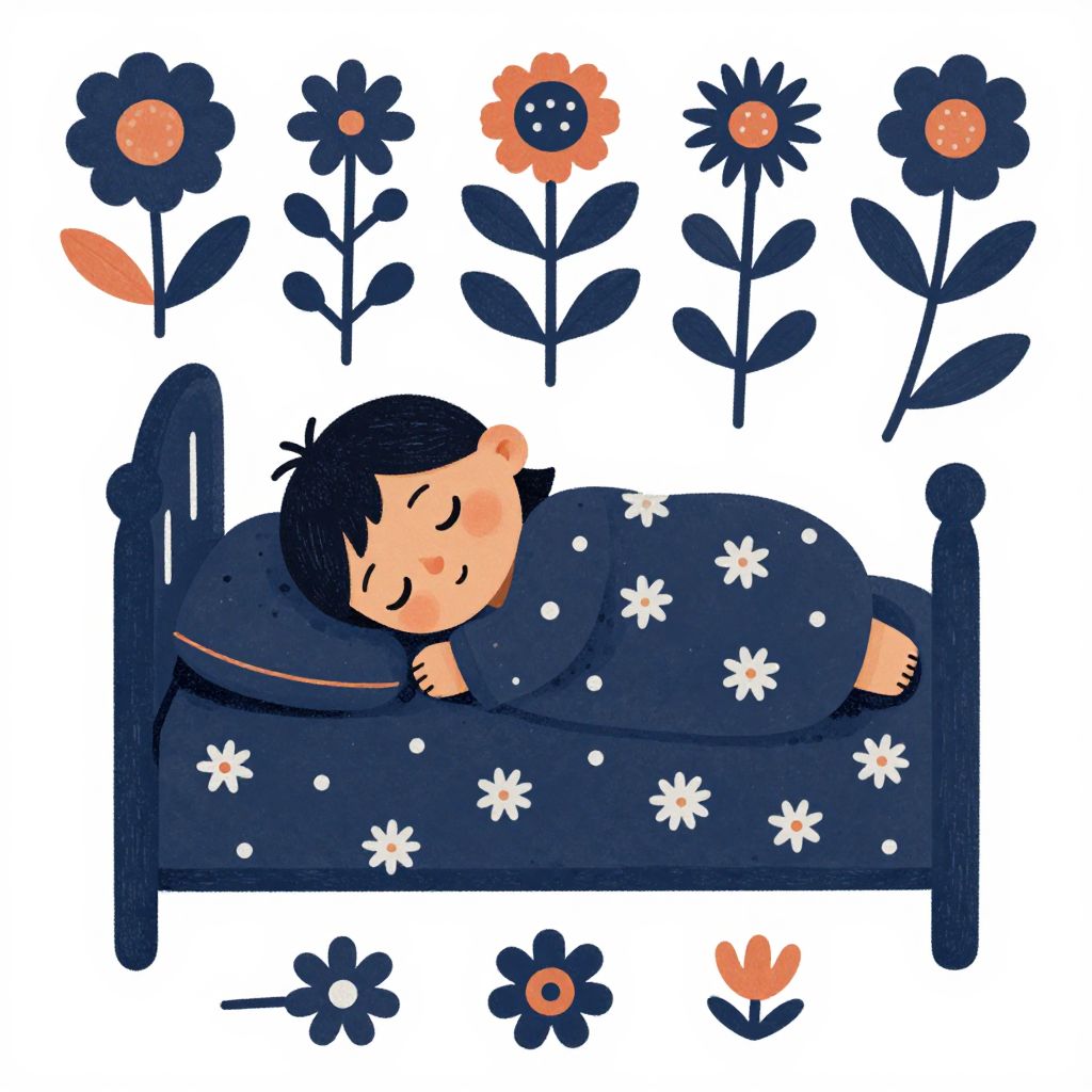 A digital drawing in a whimsical, cartoon style depicts a child with closed eyes and a peaceful expression, sleeping in a dark blue bed adorned with white flower patterns. The child, with short black hair, is wrapped in a matching dark blue blanket. Surrounding the bed are six stylized flowers with dark blue petals and orange or white centers, floating above the child. The background is white, emphasizing the colorful, simplistic design. The bed has a simple, dark blue headboard and footboard. The overall aesthetic is playful and soothing, with a focus on contrasting dark and bright colors.