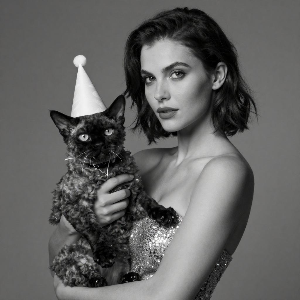 Black-and-white photograph of a blonde woman with wavy hair, wearing a white shirt, holding a small black-and-white cat. She has a serious expression, looking slightly to the right. The background is blurred, focusing attention on her and the cat.