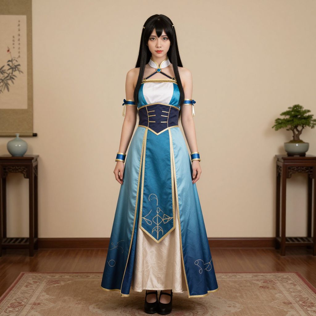 Photograph of a young Asian woman with long black hair and bangs, standing in an indoor setting with wooden floors and beige walls. She wears a blue and white medieval-style dress with gold trim, a blue corset, and matching blue and gold arm cuffs. The dress has an off-the-shoulder neckline and a flowing skirt with intricate blue patterns. She stands centered in front of a wooden table on the left holding a vase, and another on the right with a potted plant. A framed picture hangs on the left wall. Her expression is neutral, and she gazes directly at the camera.