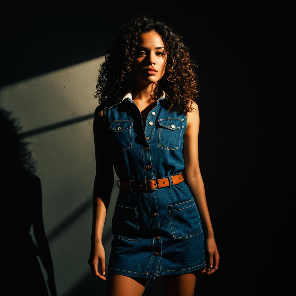 Portrait of a young woman with tousled black hair wearing a sleeveless denim mini dress with a pointed collar, front button fastening, two flap chest pockets, and a tan belt. She stands indoors near a window with golden hour sunset light casting warm shadows, creating a cinematic mood.