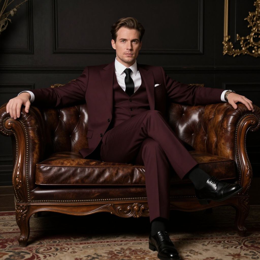 An artistic image featuring a man dressed in a refined burgundy suit, seated confidently on a classic leather sofa in an opulent, dark-toned room.