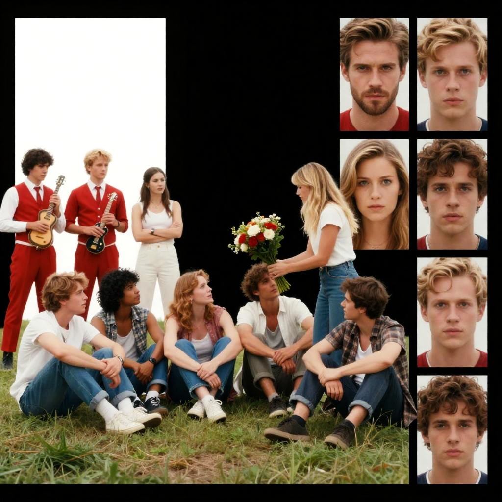 Photograph of a movie poster. Main image: group of six people sitting in grass, casually dressed, receiving a bouquet from a blonde woman. Left image: three people in red and white outfits, standing, holding instruments. Right: close-ups of six people's faces, intense expressions. Background: black with white and red accents.
