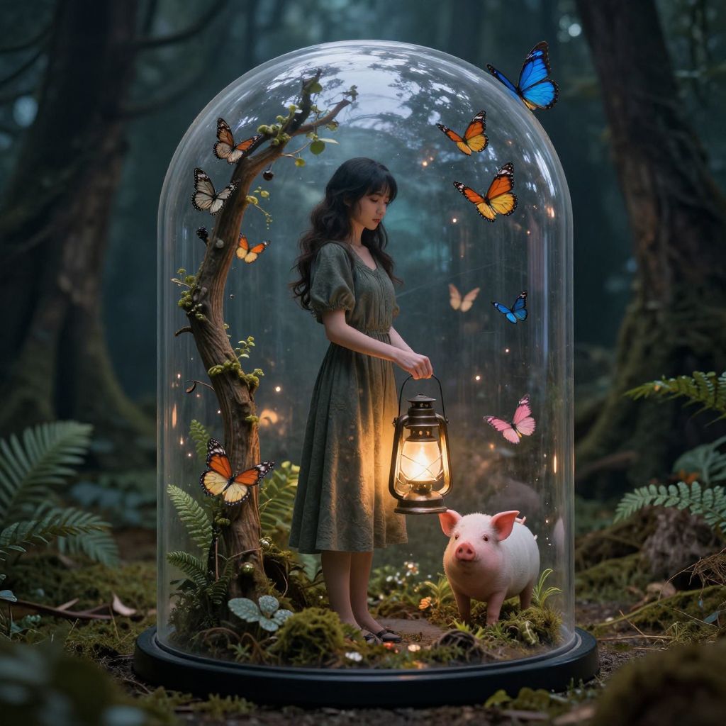 Digital artwork of a woman in a white dress, reclining in a fluffy, snake-shaped swing, surrounded by forest, butterflies, and snakes.