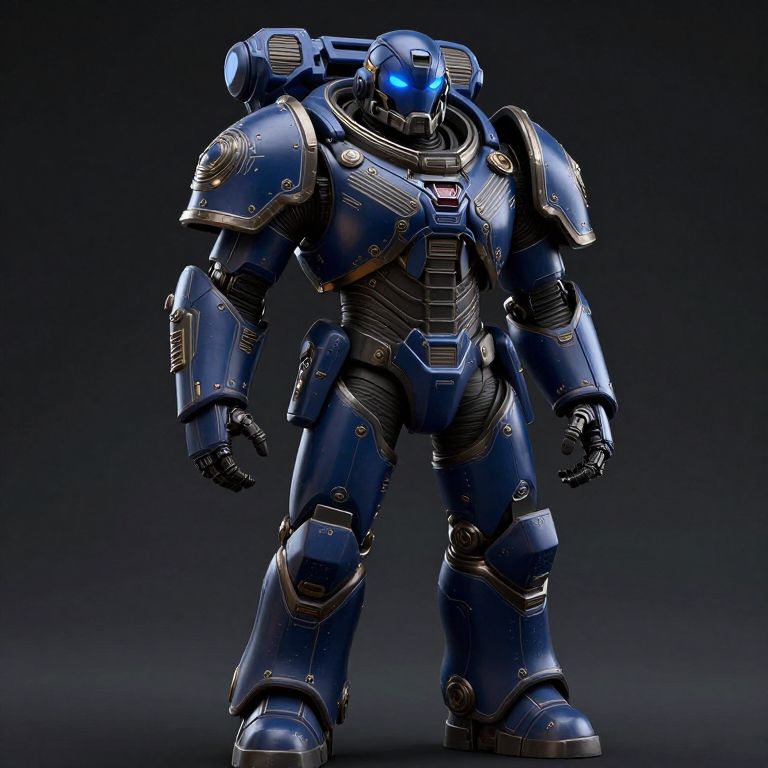 Photorealistic CGI of a blue, armored, futuristic robot with glowing blue eyes and intricate gold accents, standing against a dark gradient background.