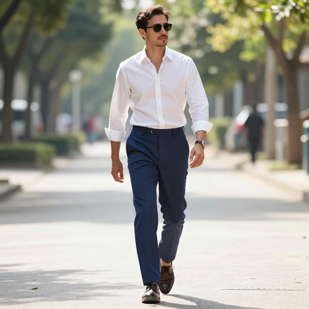 A stylish man confidently walks along a sunlit path, displaying a crisp white shirt and sharp blue trousers with a casual yet elegant vibe described by the filename's artistic theme.