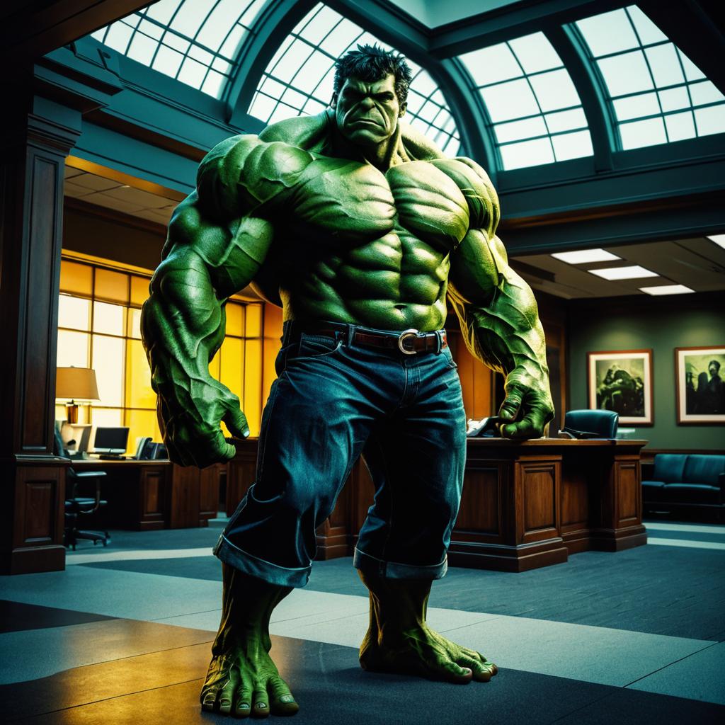 The hulk, standing in an office lobby, dramatic backlighting, autochrome, high contrast, highly detailed, sharp focus, digital painting, concept art, illustration, trending on artstation, art by greg rutkowski and greg hildebrandt, composition by alphonse mucha