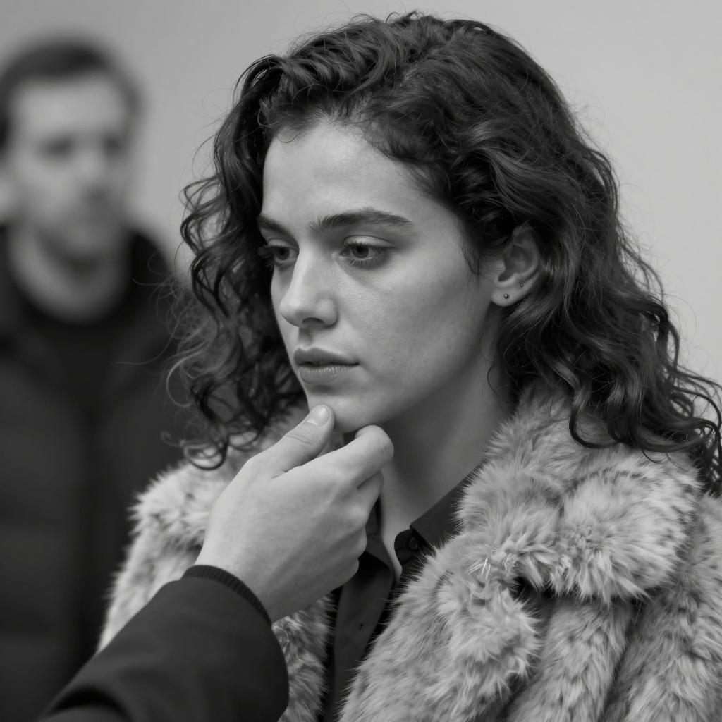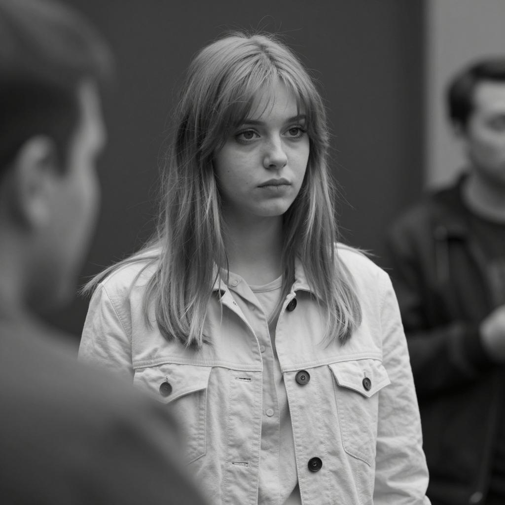 Black-and-white photograph of a young woman with light-colored, straight hair and bangs, wearing a light-colored, buttoned jacket over a light shirt. She stands with a serious expression, facing slightly to the right. A blurred figure is in the foreground on the left. Background is dark with indistinct shapes.