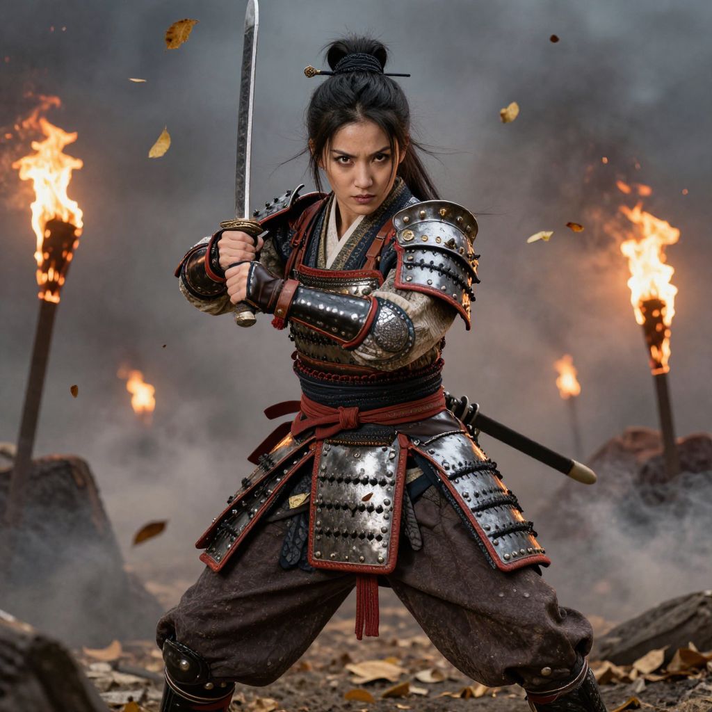 Female samurai cosplay, battle-ready stance in a smoky battlefield with burning torches and fallen leaves swirling, rugged leather and metal armor combined with traditional fabrics, fierce determination on her face, dynamic lighting highlighting textures and movement, realistic art style