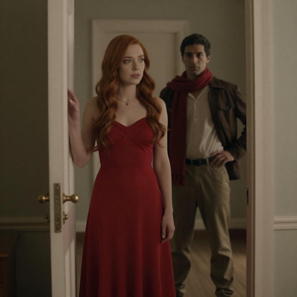 Photograph of a bar scene. Young woman with long red hair, black lace corset, and red sequin skirt stands to the left. Older man with white hat, glasses, beige suit, and patterned tie sits to the right. Bar with bottles in background. Woman's arm around man's shoulder. Warm, dim lighting. Man's relaxed expression, woman's intense gaze. Both looking at camera.