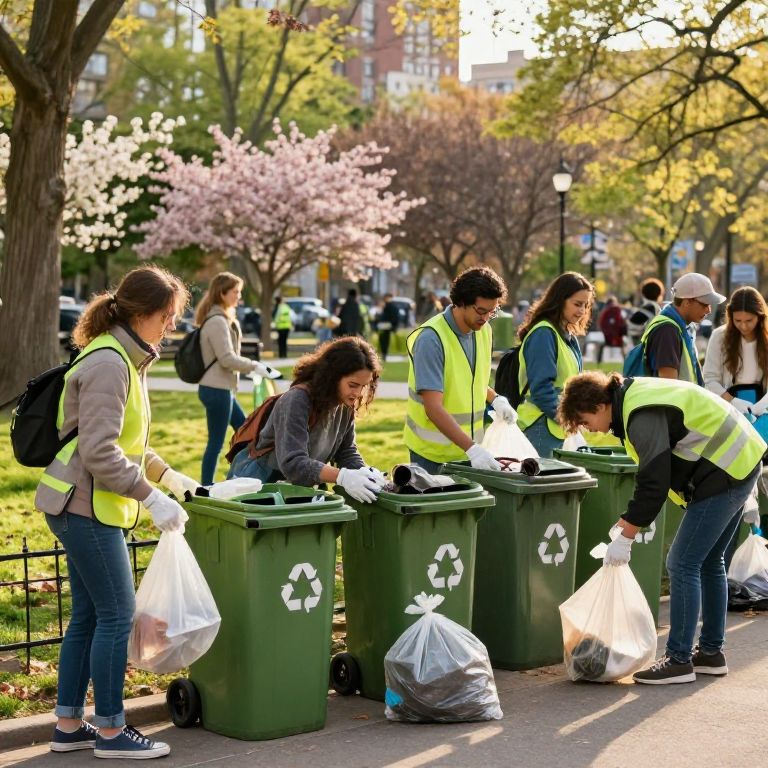 Clean up scene showing a diverse group of people enthusiastically picking up trash in a vibrant urban park during golden hour, with recycling bins and blooming trees in the background, bright colors, detailed, realistic style.