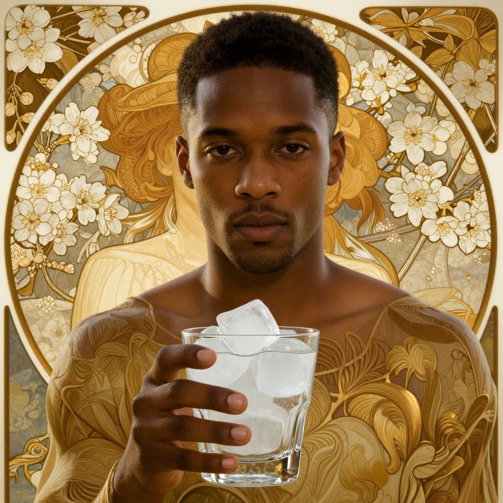 Photograph of a muscular, dark-skinned Black man with short, curly hair and a trimmed beard, holding a clear glass with a single ice cube in his right hand. He gazes directly at the camera with a serious expression. The background features an intricate, golden floral pattern with white cherry blossoms, framed by a circular golden halo. The man's upper body is adorned with a golden, floral-patterned garment that matches the background, creating a cohesive, decorative effect. The image has a high-contrast, almost surreal quality, with rich, warm colors.