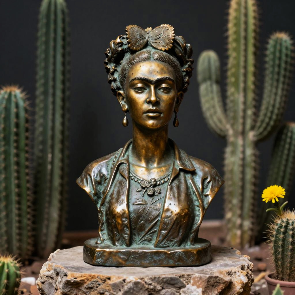Frida Kahlo statue made of bronze, resting on a rustic pedestal, surrounded by cacti and desert flowers, dramatic lighting, textured surface with a mystical aura
