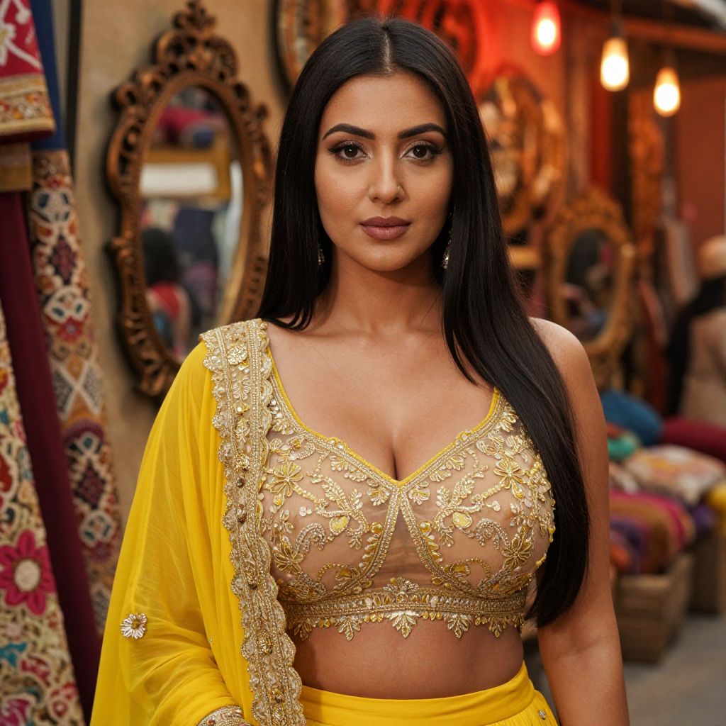 A detailed and realistic portrait of a woman with bronze skin, long straight black hair, and soft brown eyes, dressed in a beautifully crafted yellow organza lehenga with sheer gold lace details and traditional hand-embroidered motifs, posing in a vintage bazaar with colorful fabrics, mirrors, and red-hued lights in the background, as part of a costume exhibition.. The woman has big tits and cute face