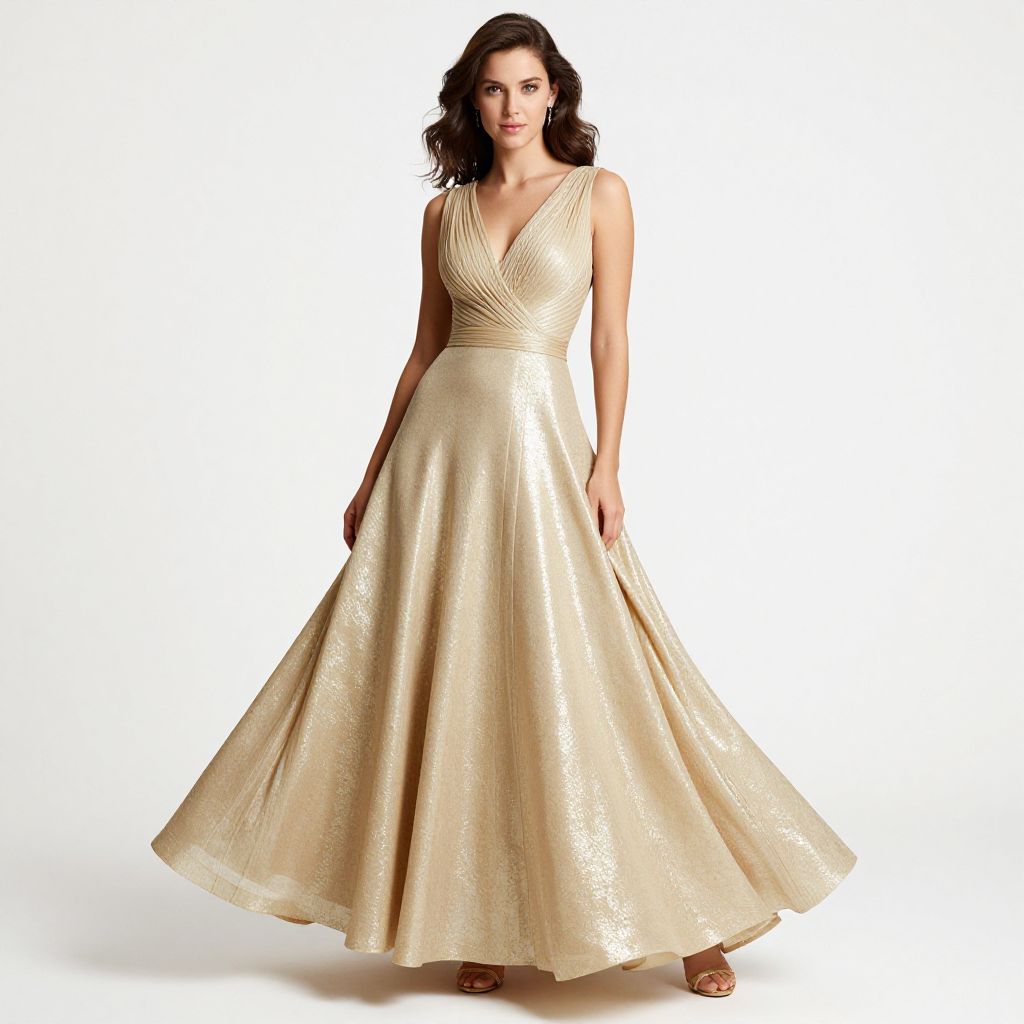 Photograph of a dark-haired woman with wavy hair, standing against a plain white background. She wears a sleeveless, floor-length, gold gown with a deep V-neck and a pleated, flowing skirt. The gown has a subtle, shimmering texture. Her arms rest naturally by her sides, and she stands slightly angled to the left. Her expression is neutral, and she wears minimal makeup. She stands in brown, open-toed high heels. The lighting is bright, highlighting the dress's elegant, metallic sheen.