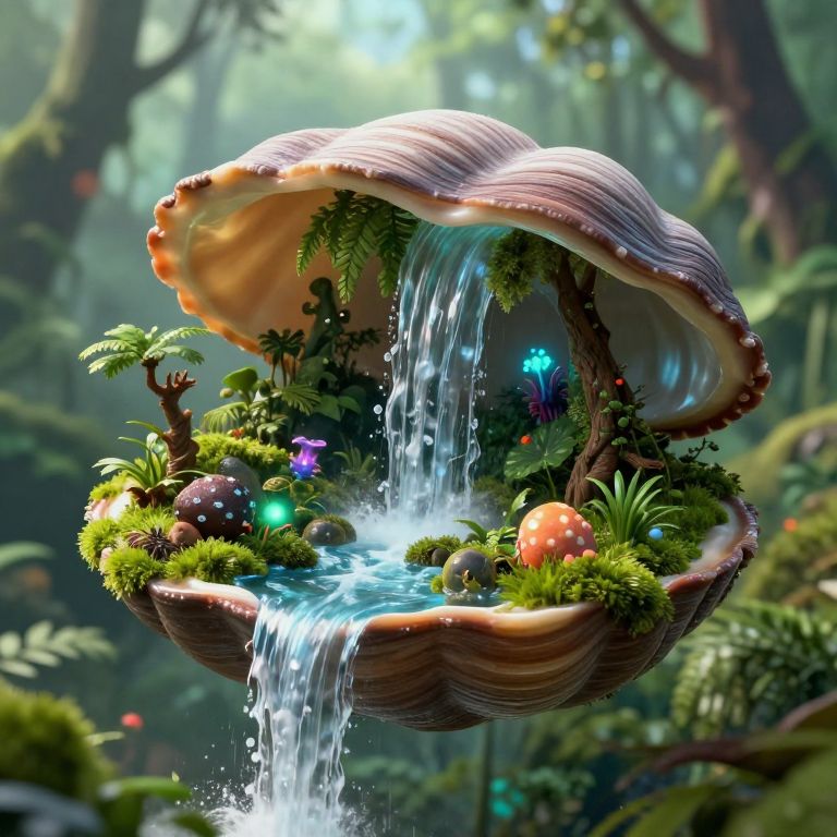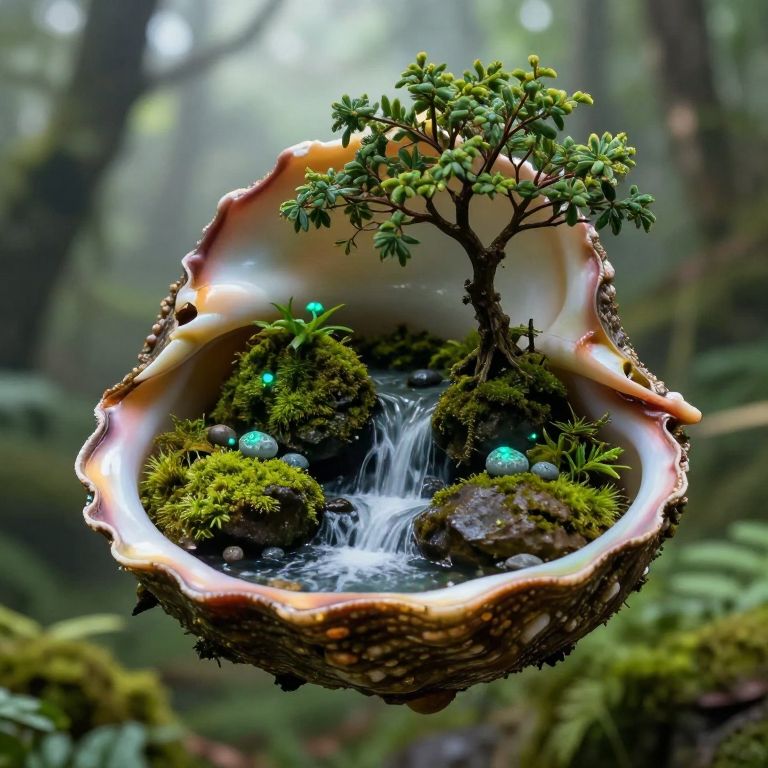 A surreal clamshell floats serenely in the misty air, cradling a miniature, thriving ecosystem of verdant moss, cascading streams, and a solitary tree, defying the boundaries of scale and gravity in a dreamlike tableau.