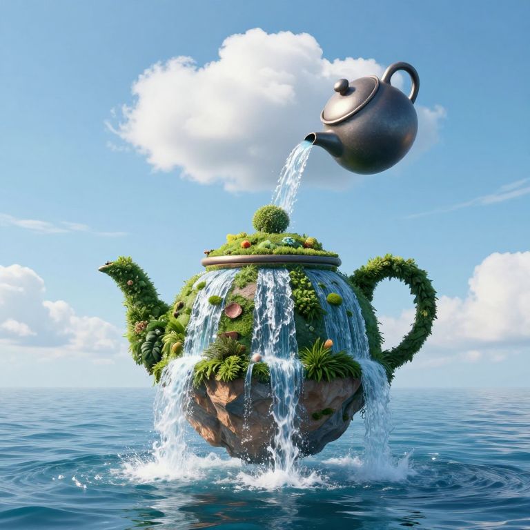 Floating miniature island with tree, waterfall, pond, moss, and rocks in CGI style; set against a misty, blurred background.