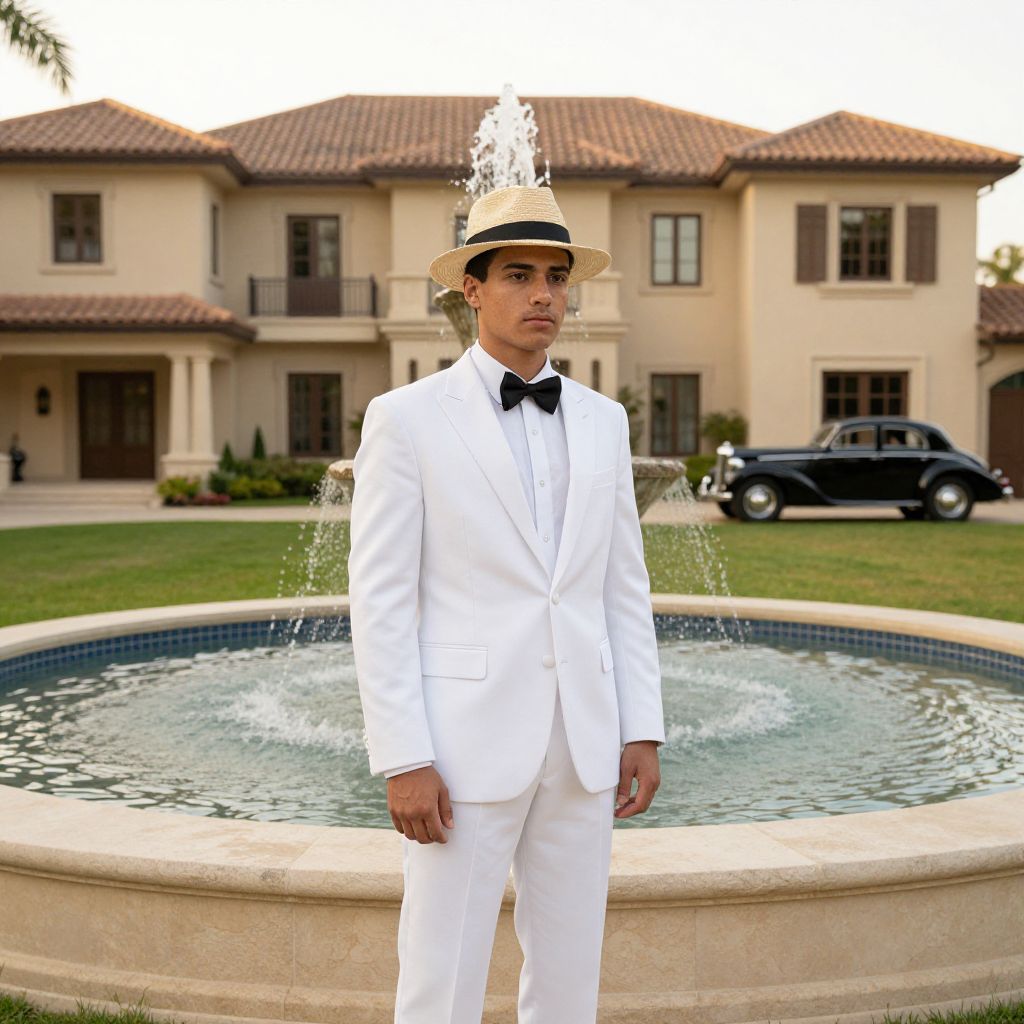 Photograph of a young man in a white tuxedo and straw hat standing in front of a fountain, with a luxurious beige mansion and classic black