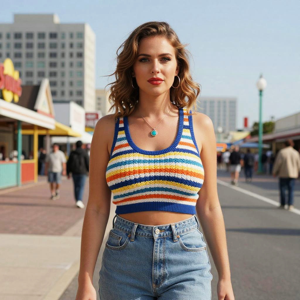 Photograph of a young woman with wavy brown hair and fair skin standing on a sunlit street. She wears a colorful, striped, knitted sleeveless crop top with horizontal bands in orange, yellow, blue, and white, and high-waisted, light blue denim jeans. She has red lipstick, hoop earrings, and a green pendant necklace. The background shows a busy street with pedestrians, shops with yellow and red awnings, and a tall, white building in the distance. The lighting is bright, casting clear shadows. The image has a slightly stylized, vibrant, and crisp appearance, enhancing the colors and details.