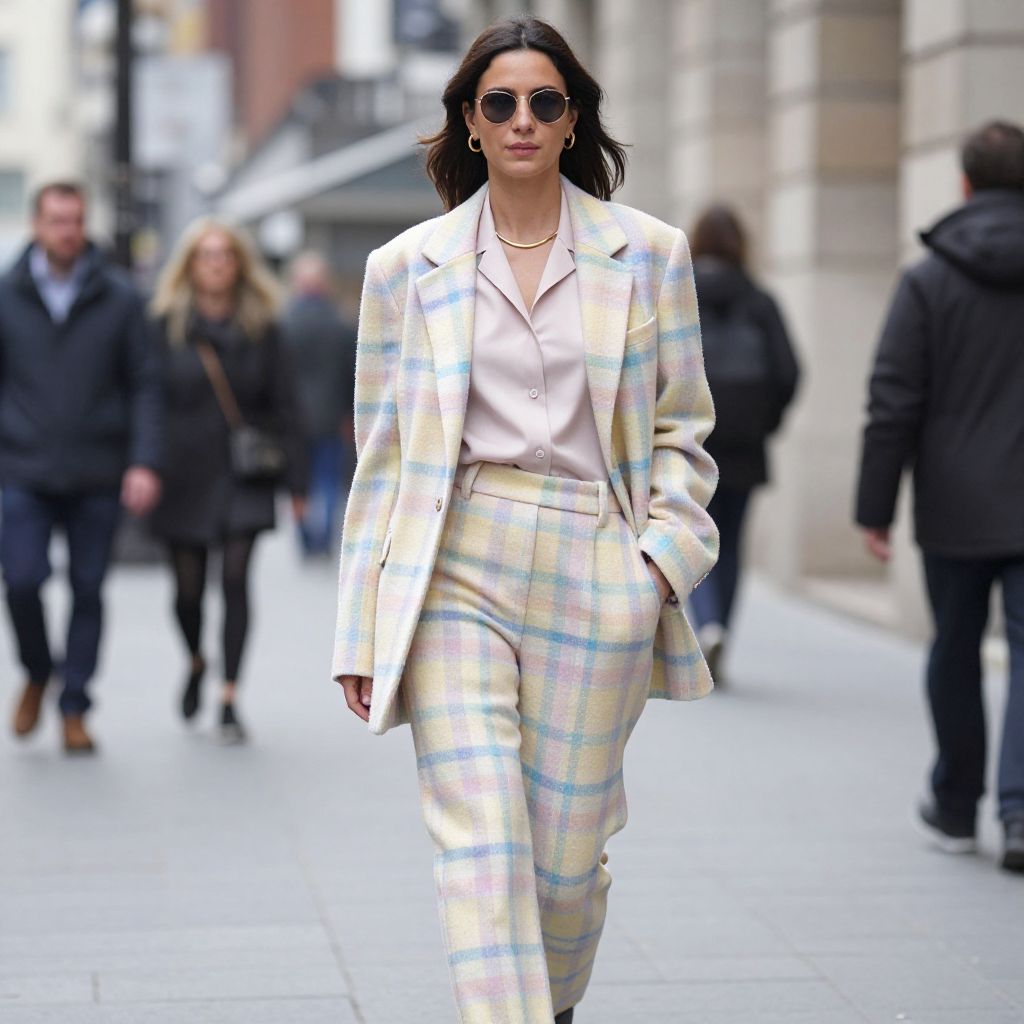 Stylishly dressed woman walking down a city street wearing a pastel check coord set featuring a oversized blazer and matching trousers, complemented by a light pink shirt and gold accessories, with blurred pedestrians and urban architecture in the background.