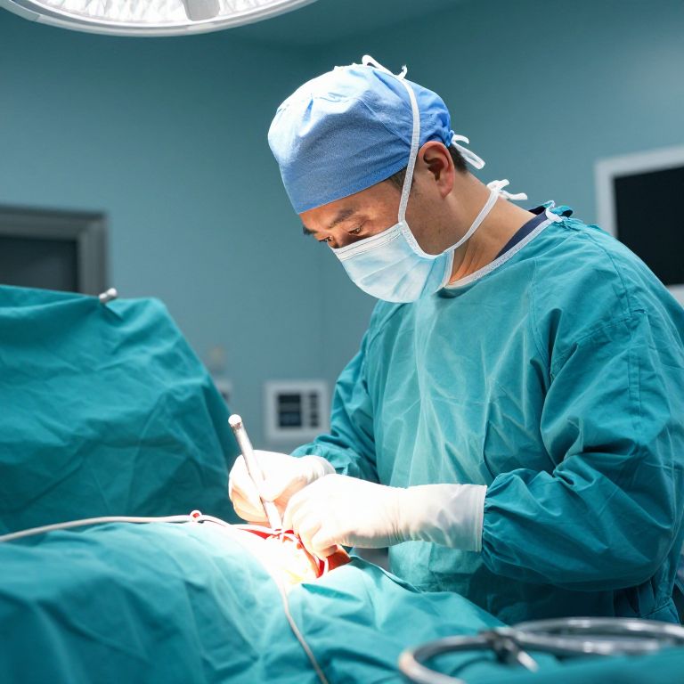 A medical doctor in a surgical gown performing laparoscopic surgery in an operating room, realistic photography