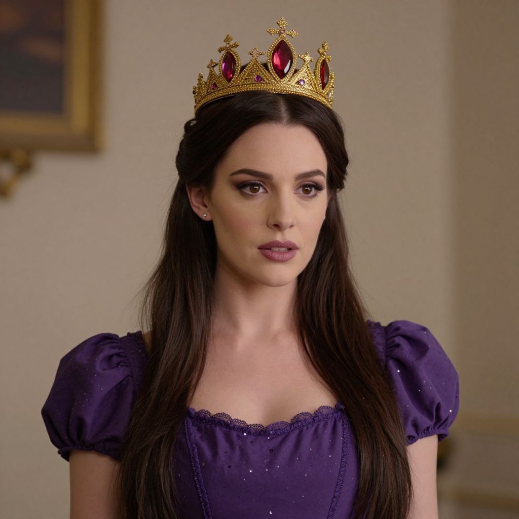 Photograph of a young woman with long, straight black hair, wearing a gold crown adorned with red jewels. She has fair skin, dark eyebrows, and is wearing dark purple lipstick. Her dress is a deep purple with puffed short sleeves and a lace trim around the neckline. She has small, pearl stud earrings. The background is a blurred, beige-colored room with a framed picture partially visible on the left. The lighting is soft, highlighting her facial features and the details of her crown and dress. The overall style is regal and elegant.