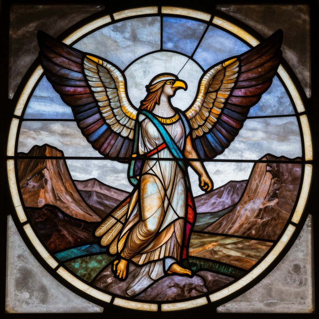 Stained glass art of a winged eagle figure with golden feathers, wearing a white robe and blue strap, standing on rocky terrain within a circular frame