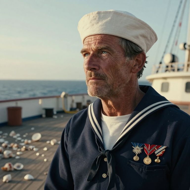 A photorealistic portrait photograph depicts a middle-aged sailor with weathered features and intense blue eyes, his rugged appearance accentuated by a vintage navy uniform adorned with medals. From an intriguing low-angle perspective, he gazes pensively towards the horizon, sunlight gently caressing his face, revealing intricate textures and shadows. The backdrop of the ship's deck, strewn with seashells and sand, hints at maritime adventures and a transient life at sea. This image captures solitude and longing, evoking an emotional spectrum that balances melancholy nostalgia with resilience and wanderlust.