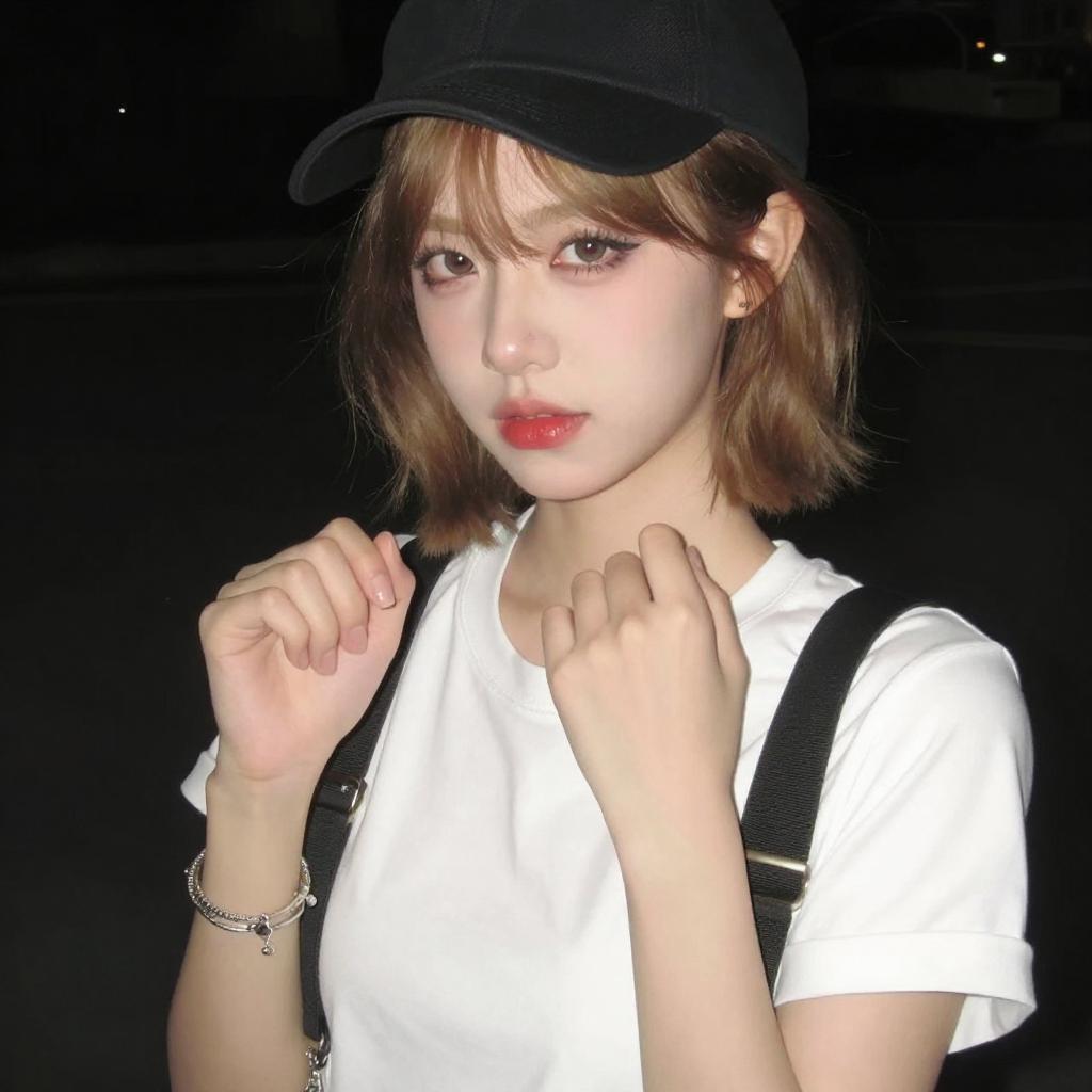 Photograph of a young woman with short, light brown hair, wearing a black cap, white t-shirt, and black suspenders. She has red lipstick, dark eye makeup, and multiple silver bracelets on her right wrist. Her hands are raised near her chest, fingers slightly curled. The background is dark, highlighting her illuminated face and hands.