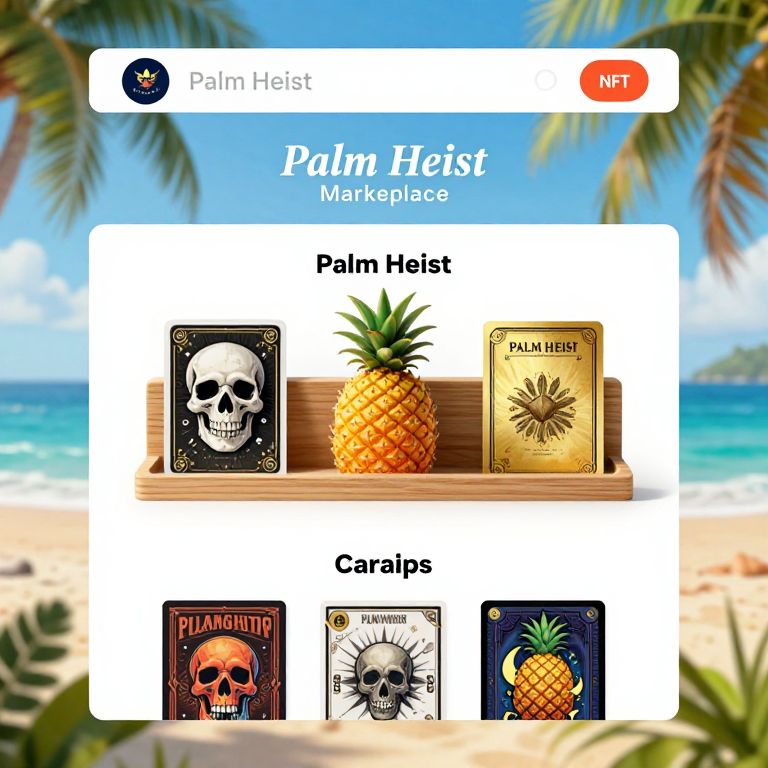 A luxurious NFT marketplace page called Palm Heist features a card shop section with a display of exotic cards, including a skull, a pineapple, and a golden card, set against a tropical beach backdrop.